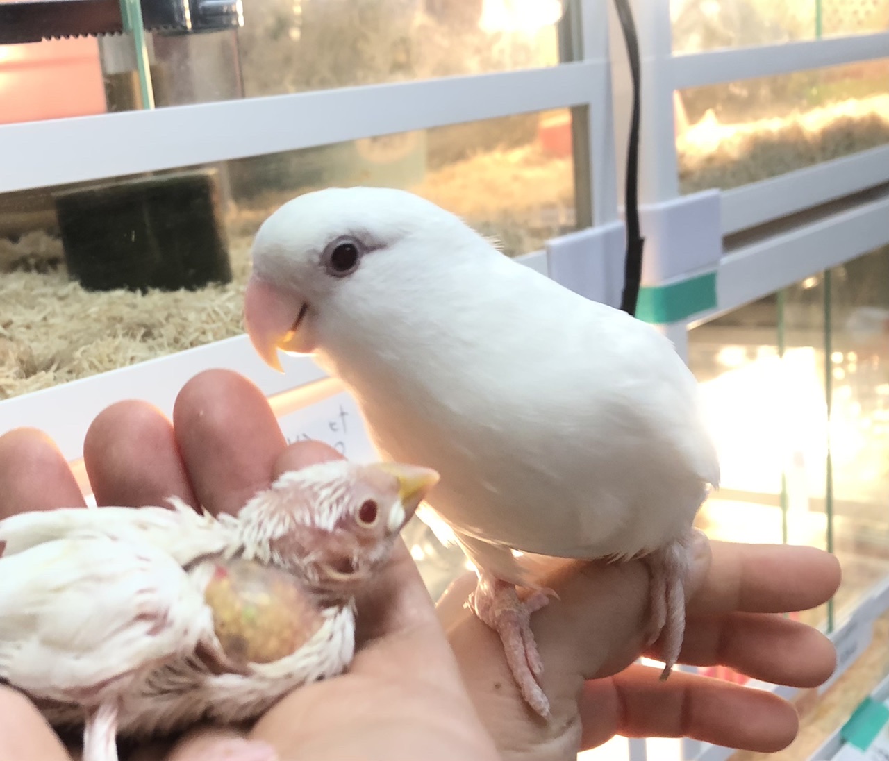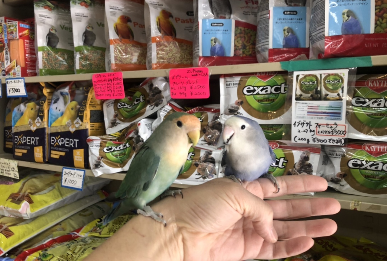 2021年2月28日瑞浪店にて撮影 岐阜県産 グリーン 1羽 ¥12000 画像の二羽販売中、この子たちの兄弟にルチノーがいます。両親はともにグリーンです。