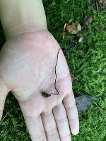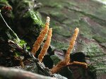 島根県の山間部沢沿い、朽木に張り付いていました。ザトウムシの冬虫夏草ではないかと思いますがどうでしょうか??