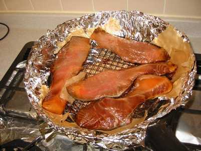 写真は巨大(鮭サイズ)なニジマスの自家製薫製です。