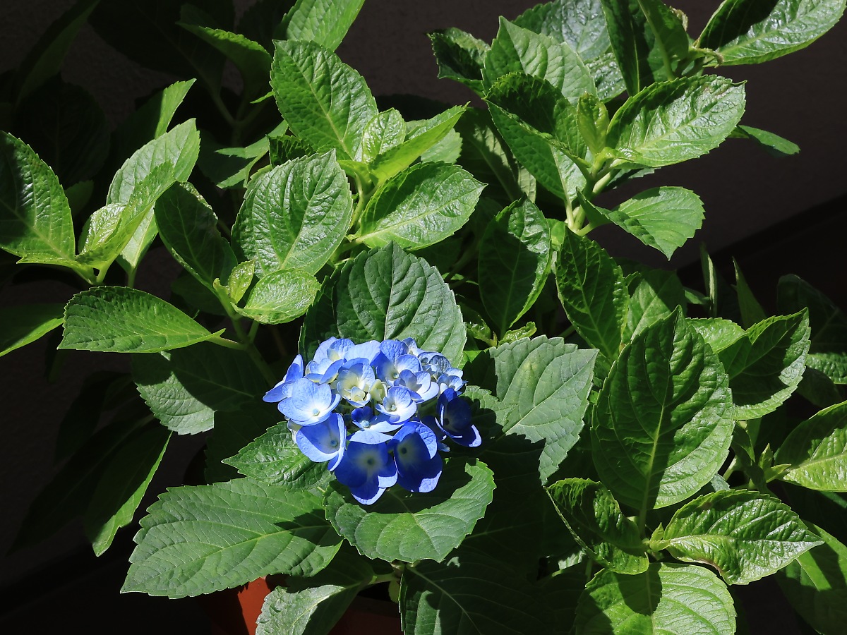我が家の鉢物は、ミニバラが終わり、「紫陽花」が咲きましたが、たった1個の花しか付かず、とても寂しい姿です。